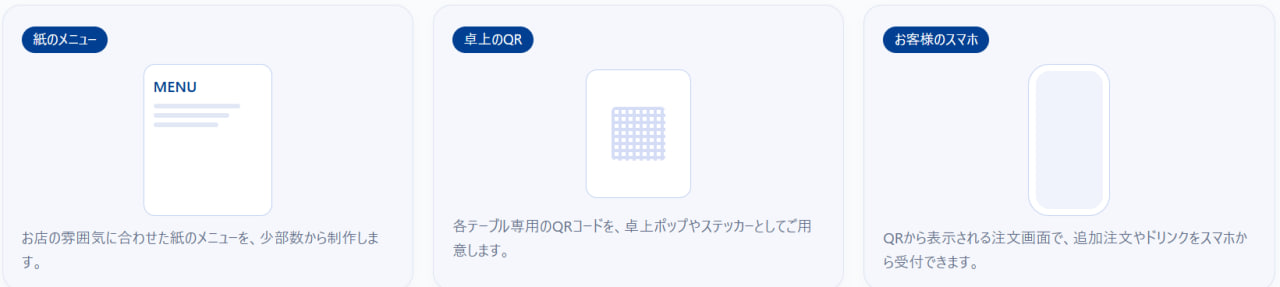 「メニュー・システム」は、少部数のメニュー印刷と、卓ごとのQRコード、 そしてシンプルなスマホ注文システムを組み合わせた、飲食店向けのサービスです。 紙のメニューはこれまで通りテーブルに置いたまま、追加注文やドリンクのご注文だけを お客様のスマートフォンから受け付けることができます。